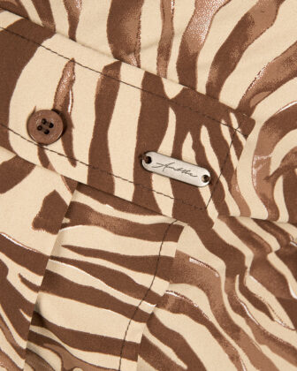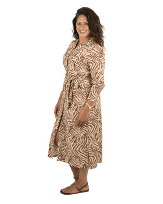 Beige/bruin travelstof zebraprint jurk van travelstof van Ambika. Jurk met doorlopende knoopsluiting en loopsplitjes in de zijnaad. Een supermooie jurk om in te stralen!