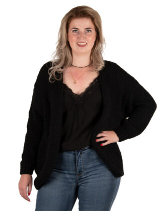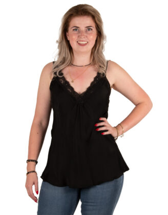 Zwart satijnen hemdje met kant. Mooi hemdje met V-hals en kanten schouderbandjes. Een heerlijk hemdje om te combineren met een vest, blazer of jasje.