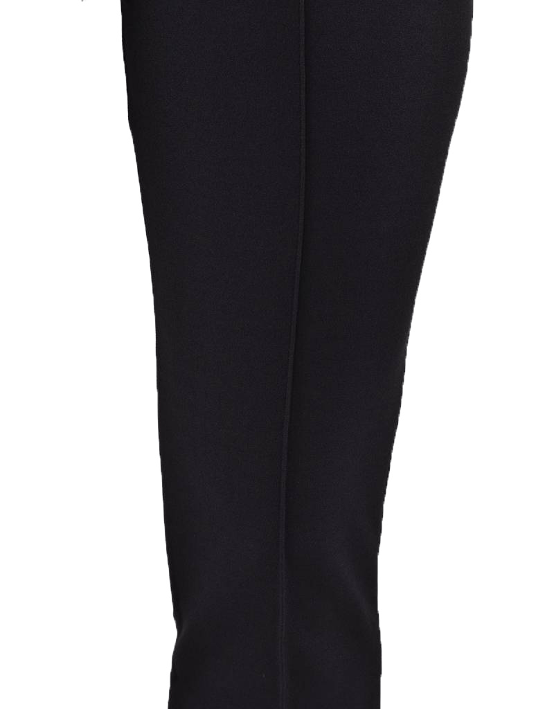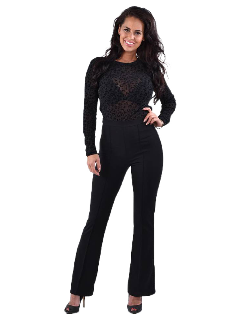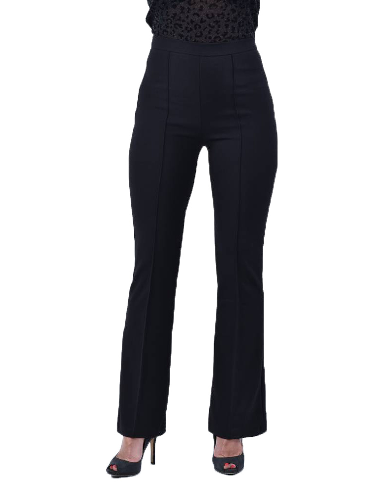 Zwarte pantalon met flared pijpen en een geblindeerde rits in de zijnaad. Heerlijke stretch broek met een hoog draagcomfort.