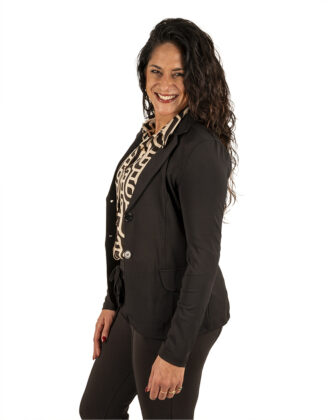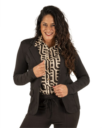Zwarte travelstof blazer van Vera Jo. Supermooie licht getailleerde blazer in een hele fijne stretch kwaliteit. Super combinatie met bijpassende pantalon.